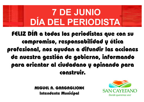 Aprovecho el DIA DEL PERIODISTA para hacerles llegar mi más sinceras felicitaciones a todo el equipo de Caynet y agradecerles por ser diariamente el conducto que me mantiene informado sobre las novedades del pueblo.