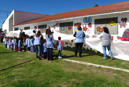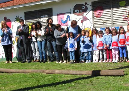 En primera instancia, se inauguró oficialmente el mural realizado en forma conjunta con la dirección de Educación y Cultura a través del Taller de Muralismo. Dirigidos por el profesor Ariel Espósito, y con la colaboración de las alumnas Gabriela Romano, Carina Núñez, Dora Guzmán y Cristina Carrín, los niños de las salas de 5 años dejaron su marca en la pared lateral del Jardín, con dibujos creados íntegramente por ellos.