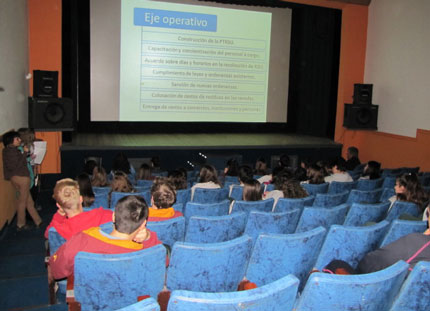 En primera instancia, en el Teatro Municipal, luego de la presentación y bienvenida realizada por el secretario de Gobierno Manuel Sampayo y demás funcionarios municipales, se proyectó un power en el cual se explicaron los distintos ejes de trabajo (educativo, publicitario, operativo y comunitario) que se desarrollaron, desde la decisión política de construir la Planta de Tratamiento, pasando por la concientización a la población, hasta ver el trabajo de los operarios.