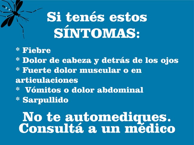 Los síntomas del dengue son: fiebre acompañada de dolor detrás de los ojos, de cabeza, muscular y de articulaciones; náuseas y vómitos; cansancio intenso; aparición de manchas en la piel; picazón y sangrado de nariz y encías.