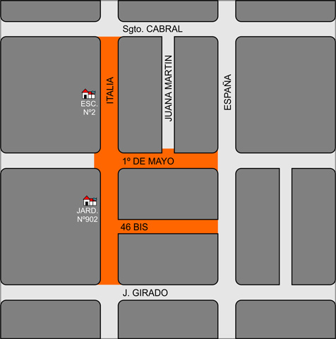 LA COOPERATIVA DE PROVISION DE SERVICIOS ELECTRICOS COMUNICA A SUS USUARIOS QUE, DURANTE LA MAÑANA DEL LUNES 22 DE MAYO SE PRODUCIRA UN CORTE DE ENERGIA ELECTRICA EN EL HORARIO DE 8:00 A 10:00 HS, PARA REALIZAR TAREAS DE MANTENIMIENTO SOBRE LA LÍNEA DE BAJA TENSIÓN QUE SE EXTIENDE SOBRE LA CALLE ITALIA, AFECTANDO A LOS USUARIOS QUE SE ENCUNTRAN SOBRE LAS CALLES ITALIA, DESDE SARGENTO CABRAL HATA 1º DE MAYOY LAS CALLES 1º DE MAYO Y 46 BIS ENTRE ITALIA Y ESPAÑA, DE ACUERDO A LO INDICADO EN LA IMAGEN.