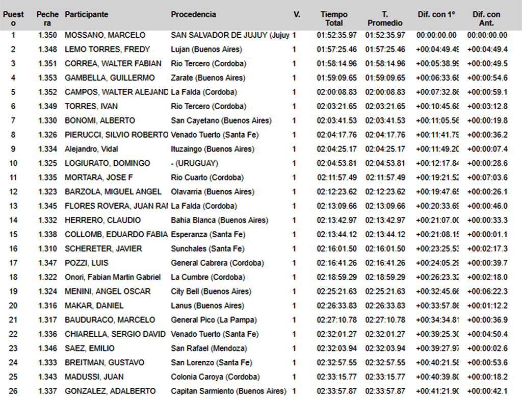 El ganador de la carrera fue el mendocino Enzo Fredes con un tiempo de 1h39’19” seguido por el cordobés Matías Baudino (1h40’24”) y el puntano Miguel Hidalgo (1h41’00”).