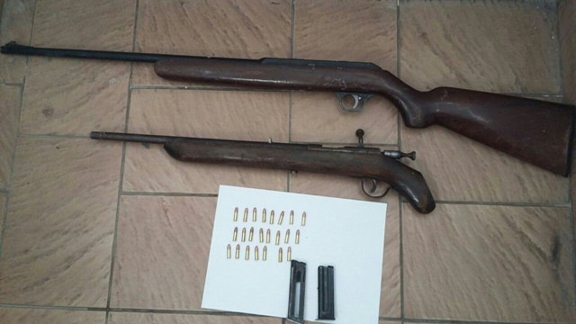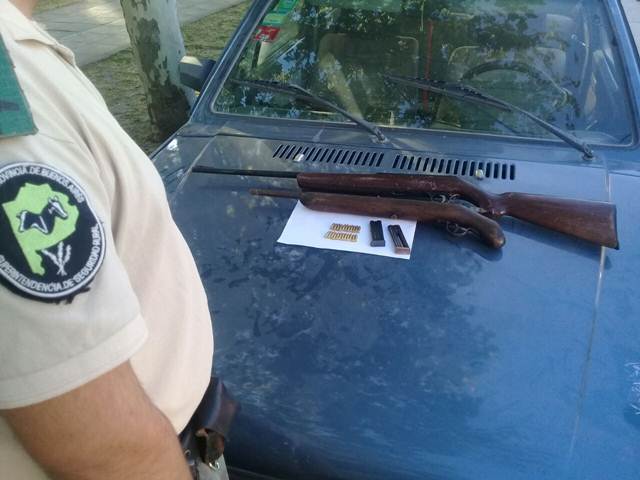 Efectuada requisa en el automotor, se secuestró, una carabina calibre 22 largo, marca FM, otra carabina calibre 22 recortada, marca Diana, con munición en recámara, dos cargadores (uno almacenando cinco cartuchos intactos) y otros 23 mismo calibre, encamisados punta hueca.