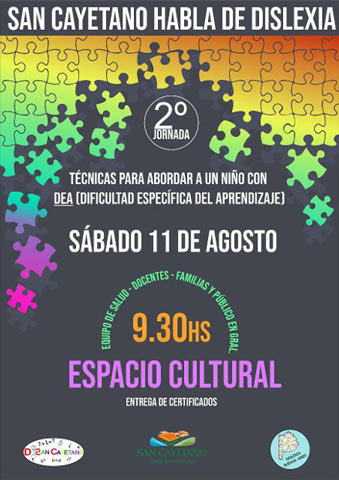 Con la organización del grupo Dislexia-discalculia San Cayetano y la Municipalidad local a través del área de Salud, el próximo sábado 11 de agosto a partir de las 9:30 hs en el Espacio Cultural, se desarrollará la segunda jornada sobre dislexia.