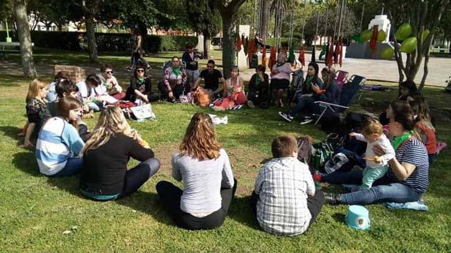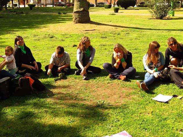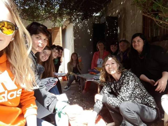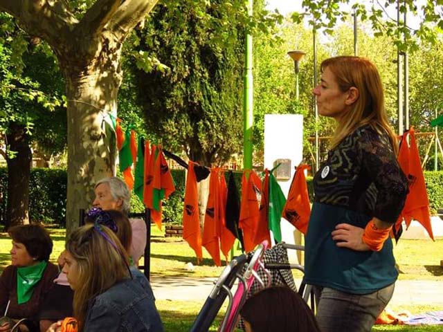 Después de un almuerzo de presentación en la que cada una dijo por qué es feminista y por qué forma parte de esta ola, fuimos a la plaza. Con música feminista y ronda de mate, conversamos en primer lugar sobre el 33° Encuentro Nacional de Mujeres (ENM) que se realizó en Trelew, del que participaron más de 50 mil personas. Les preguntamos a nuestras feministas vecinas cómo habían vivido el encuentro quienes viajaron a Chubut y en qué actividades habían participado (hubo más de 70 talleres). Luego se refirieron a la lamentable cobertura que hicieron los medios hegemónicos de comunicación (que solo mostraron imágenes que apuntan a deslegitimizar al feminismo y al encuentro). Nos dejaron folletería para interiorizarnos en los distintos talleres y actividades que propone anualmente el ENM, como así también sobre feminismo en general y sobre la Colectiva de Chaves en particular.