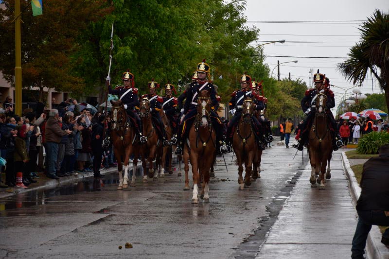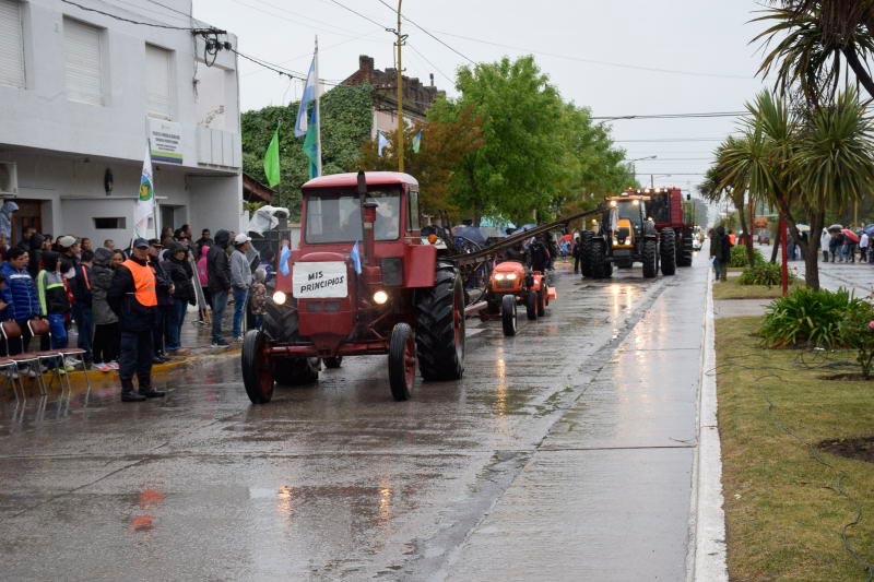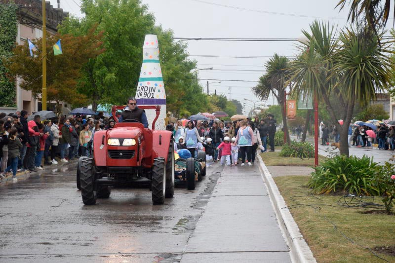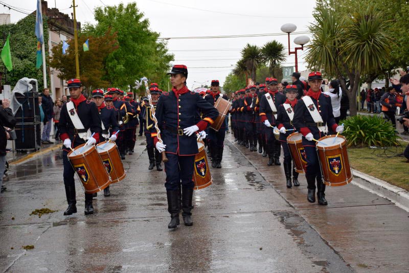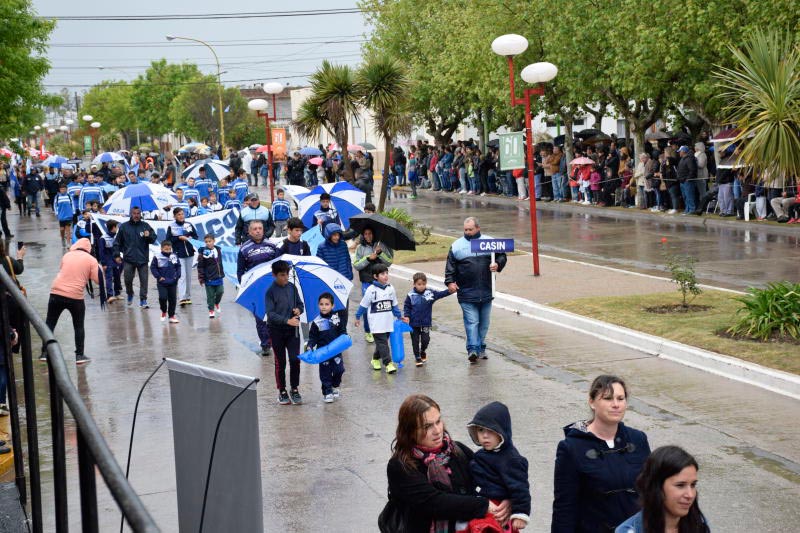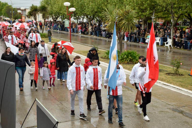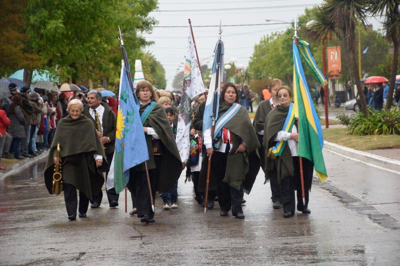 Luego de la entrega de presentes a los Intendentes de Necochea y Lobería, Facundo López y Juan José Fioramonti, integrantes del grupo Papelnonos fueron los encargados de portar las banderas nacional, provincial y distrital, sumadas a las del propio grupo y la de la Paz, y dejar así oficialmente inaugurado el desfile cívico. Con la Banda Militar “Puerto Argentino” de la Brigada de comunicaciones 181, a cargo de Teresa Luna, sonando de manera casi contínua, representantes de instituciones educativas, deportivas, sociales, religiosas, civiles y tradicionalistas desfilaron frente al palco oficial, culminando con el paso del Escuadrón Junín del Glorioso Regimiento de Granaderos a Caballo General San Martín, Escolta Presidencial.