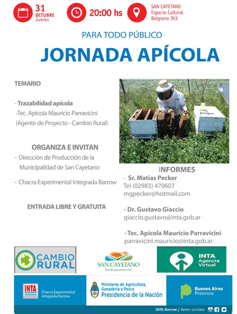 En el marco del ciclo de charlas que organiza el área de Producción, en forma conjunta con el INTA y la Chacra Experimental Integrada Barrow, el próximo jueves 31 de octubre se desarrollará una jornada apícola.