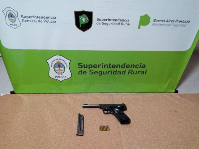 En el rodado se halló en el habitáculo trasero debajo del asiento y sobre el piso, una pistola semi automática con cargador conteniendo 7 municiones intactas punta hueca, elementos estos que fueron secuestrados ante testigo.