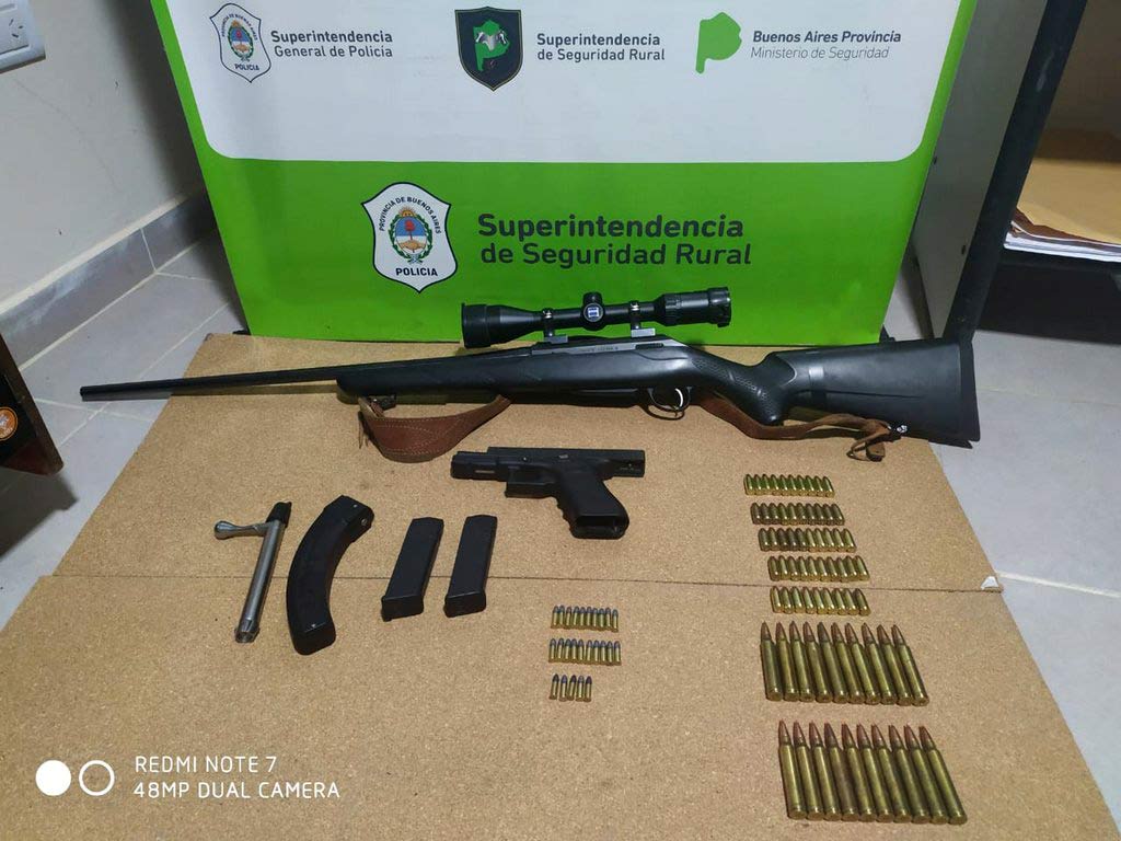 Se hallaron en el interior del rodado una Pistola semiautomática marca GLOCK 17 Calibre 9 milímetros con dos cargadores con 17 municiones cada uno; un Fusil a repetición calibre 300, con 20 municiones calibre 300; y un cargador curvo 25 municiones.