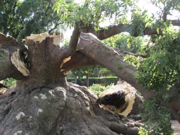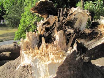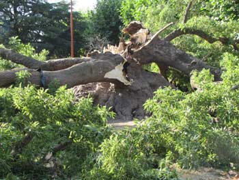 Sorpresivamente, el centenario ombú que identificaba la Plaza América de nuestra ciudad hoy amaneció totalmente en el suelo. Examinando el mismo se desprende que la caída fue producto de décadas en estado de putrefacción interna del tronco principal, el cual no pudo soportar más el peso de las innumerables ramas que poseía.