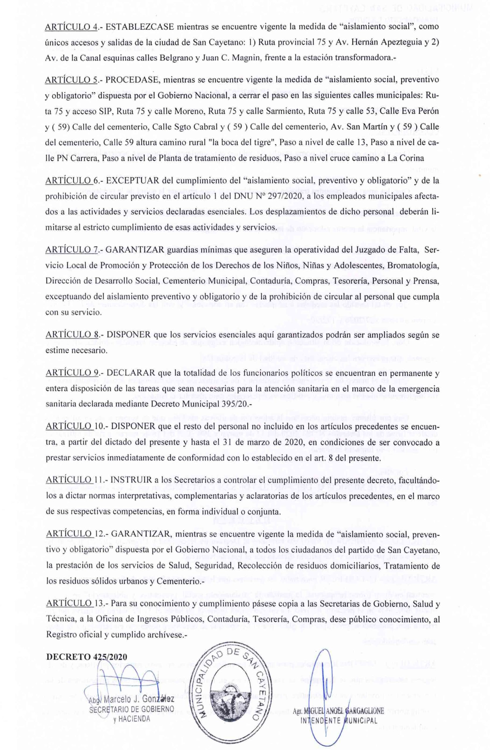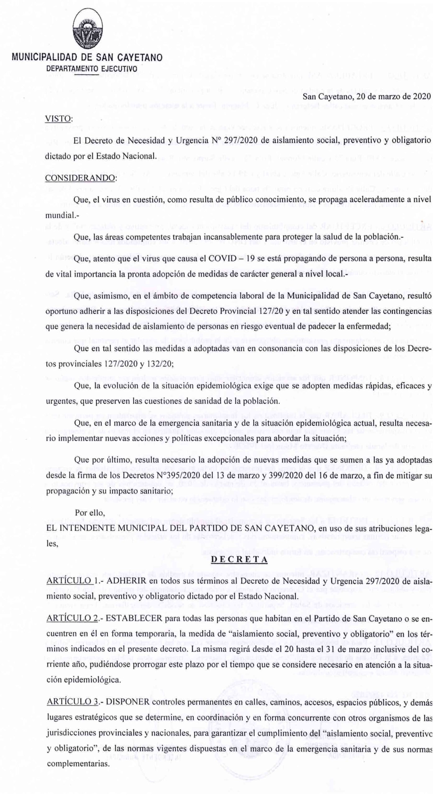 A través del Decreto N°425/2020 firmado por el Intendente Miguel Gargaglione, San Cayetano adhiere en todos sus términos al Decreto de Necesidad y Urgencia N° 297/2020 de aislamiento social, preventivo y obligatorio, dictado por el Gobierno Nacional.