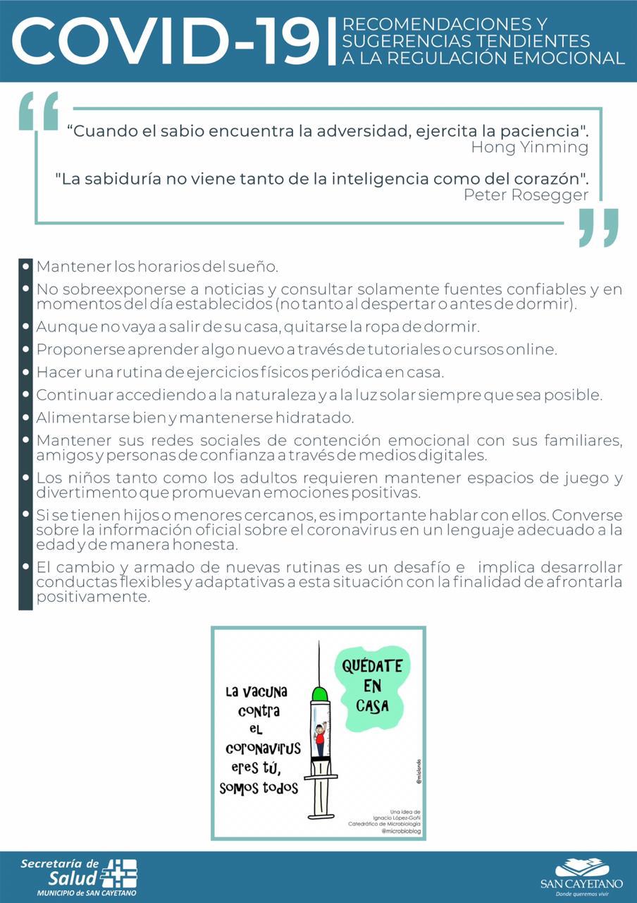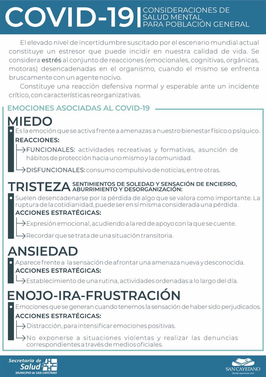 El estado de emergencia sanitaria actual provocado por la situación de pandemia nos conduce a considerar la importancia de realizar intervenciones sobre lo mental en la salud. Es por ello, que desde el Hospital Municipal de San Cayetano se ha elaborado una guía básica para el afrontamiento del presente contexto crítico desde el punto de vista psicológico.
