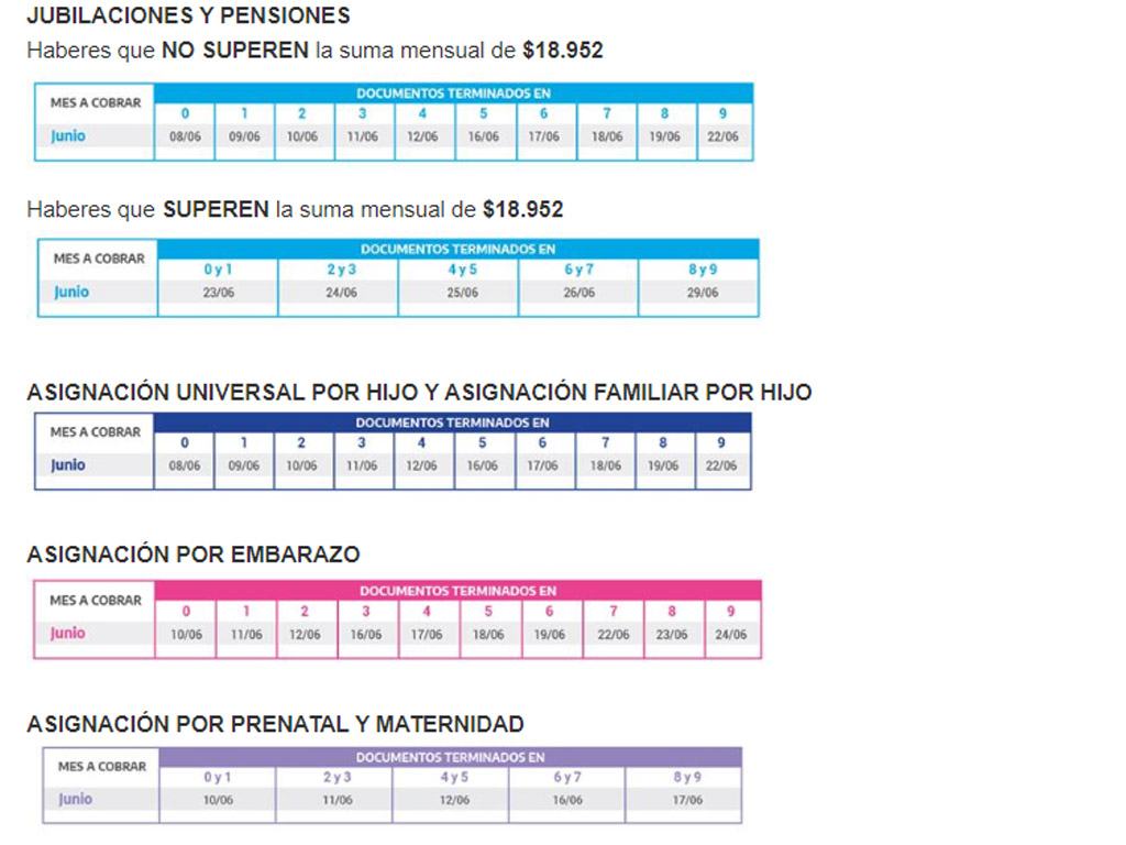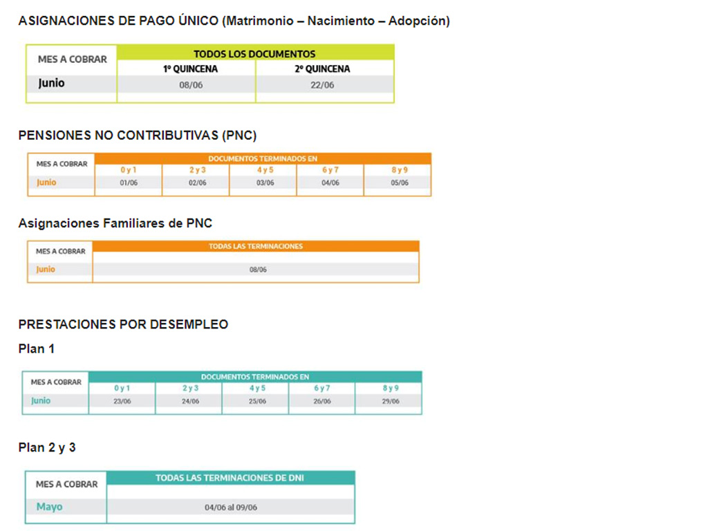 La ANSES informa los calendarios de pago del mes de junio para jubilados y pensionados, Pensiones no Contributivas, los beneficiarios de la Asignación Universal por Hijo y por Embarazo, Prestación por Desempleo y Asignaciones Familiares y de Pago Único (Matrimonio, Nacimiento y Adopción).