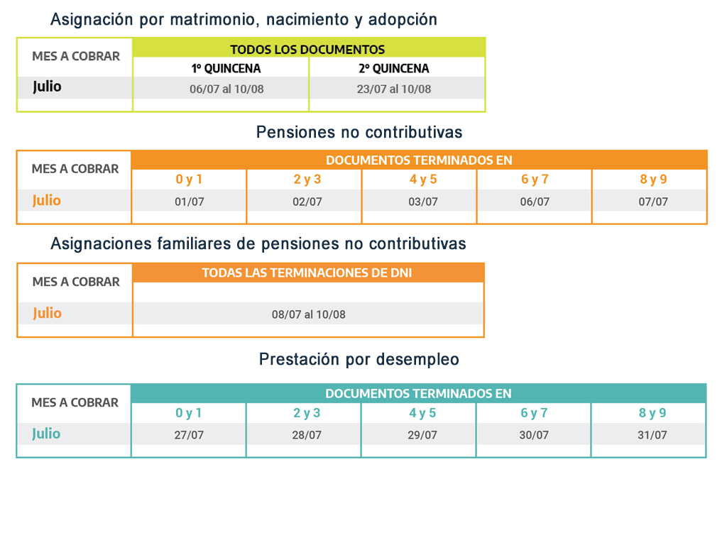 La ANSES informa los calendarios de pago del mes de julio para jubilados y pensionados, Pensiones No Contributivas, beneficiarios de la Asignación Universal por Hijo y por Embarazo, Prestación por Desempleo y Asignaciones Familiares y de Pago Único (Matrimonio, Nacimiento y Adopción).