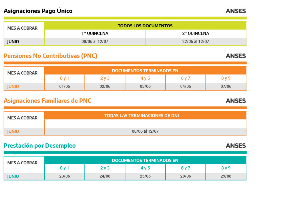 La ANSES, organismo a cargo de la Lic. Fernanda Raverta, informa el calendario de pagos del mes de junio para jubilados, jubiladas, pensionados y pensionadas, Pensiones No Contributivas, titulares de la Asignación Universal por Hijo y por Embarazo, Asignaciones Familiares y de Pago Único (Matrimonio, Nacimiento y Adopción) y Prestación por Desempleo.