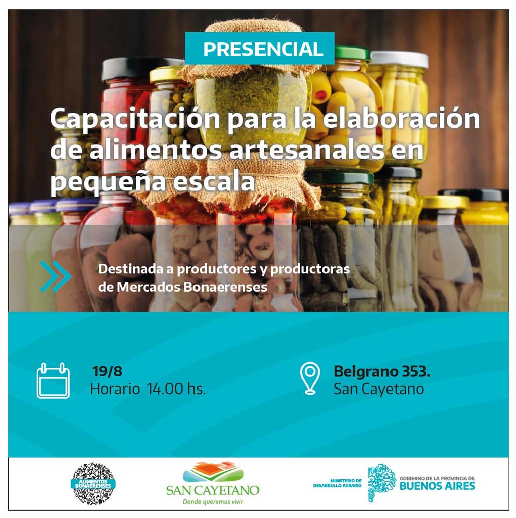 Con el objetivo de brindar herramientas para optimizar la producción y posterior venta de microemprendedores, la Dirección de Producción junto al Ministerio de Desarrollo Agrario de la provincia de Buenos Aires organizan una capacitación para la elaboración de alimentos artesanales a pequeña escala.