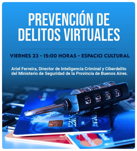 El próximo viernes 23 a las 15:00 horas en Espacio Cultural se llevará a cabo una charla abierta sobre Prevención de delitos virtuales. La misma estará a cargo del Ingeniero Ariel Ferreira, Director de Inteligencia Criminal y Ciberdelito del Ministerio de Seguridad de la provincia de Buenos Aires.