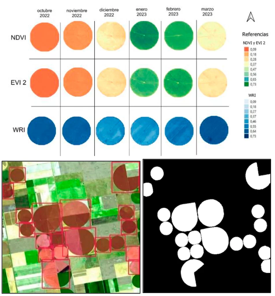 Este logro se basó en el modelo Grounding DINO, una técnica que combina visión por computadora con descriptores textuales. Esto permitió aprovechar modelos de lenguaje previamente entrenados para mejorar la identificación automática de los círculos de riego. Además, el análisis incorporó índices espectrales como NDVI, EVI2 y WRI, que ayudaron a resaltar los patrones circulares asociados a los cultivos irrigados.