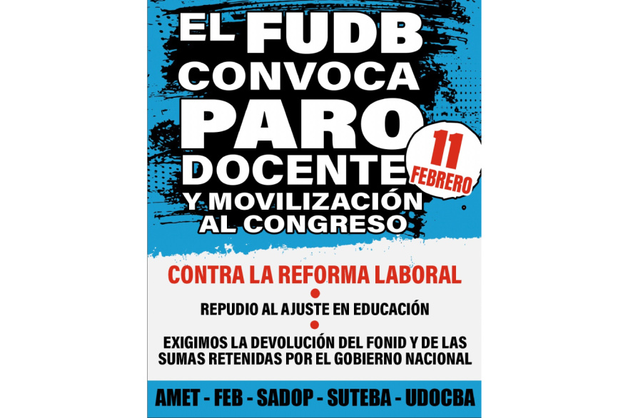 Para mañana, miércoles 11 de febrero, el Frente Gremial Unidad Docente Bonaerense (FUDB), que nuclea a los principales gremios docentes de la provincia de Buenos Aires —AMET, FEB, SADOP, SUTEBA y UDOCBA—, adhiere al paro general con movilización en el marco del tratamiento legislativo de la reforma laboral, al considerar que la iniciativa atenta contra los derechos adquiridos de los trabajadores de todo el país.