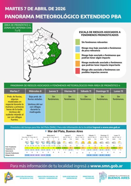 El sudeste de la provincia de Buenos Aires tendrá un comienzo de semana marcado por condiciones inestables, con lluvias y viento durante martes y miércoles, según el último informe difundido por el Servicio Meteorológico Nacional.