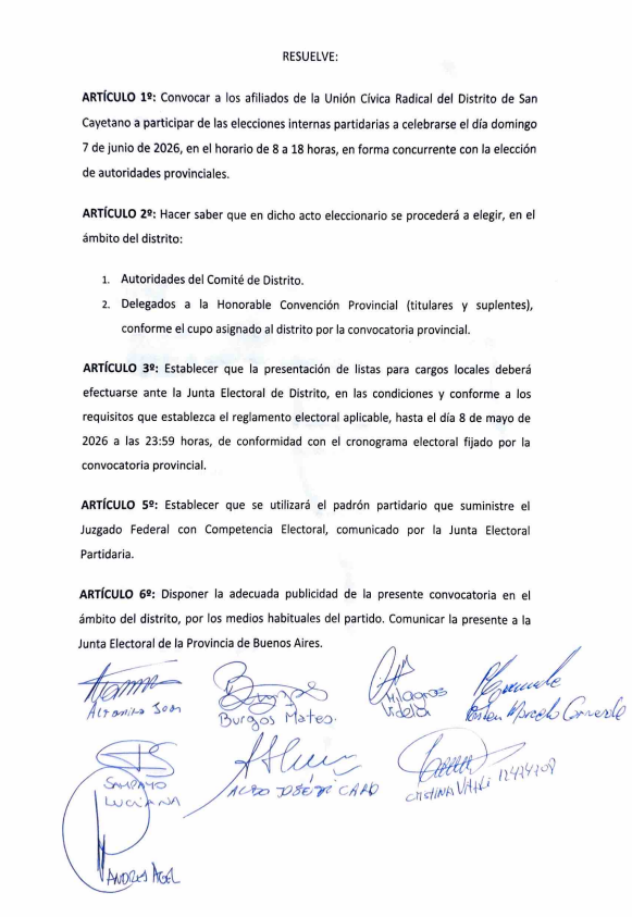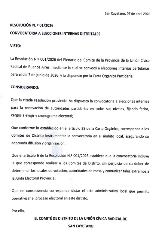 El Comité Leandro N. Alem de San Cayetano informa a la comunidad y a la militancia radical que, en cumplimiento de la Resolución Nº 001/2026 del Plenario del Comité de la Provincia de Buenos Aires y de lo establecido por la Carta Orgánica partidaria, se ha resuelto formalizar la convocatoria a elecciones internas locales para la renovación de autoridades.