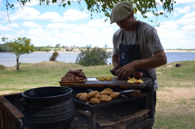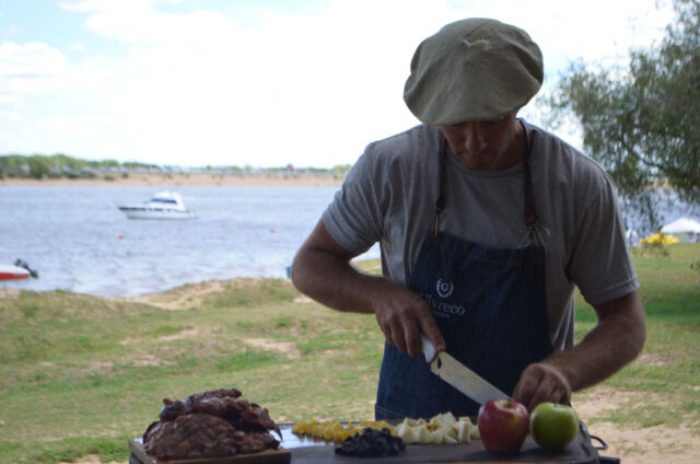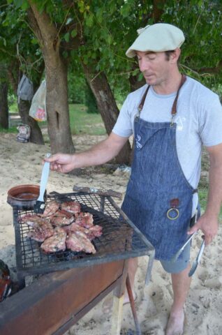 Cruzamos en la lancha de Mauro muy temprano hacia la isla Cambacuá, bañada por las aguas del Río Uruguay y lo que nos contó nuestro amigo «Quique» Sobral sobre estos magníficos cocineros fue plasmado en recetas bien entrerrianas. Con un sellado del carpincho en la parrilla, se incorporaron a la marinera hierbas autóctonas en el ahumado y se concluyó la cocción friendo a la olla de hierro.