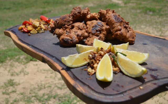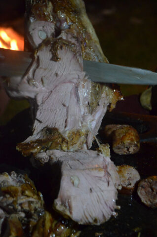 Mauro se fija en cada detalle, desde la elección del lugar hasta los ingredientes que asombran por su combinación perfecta. Junto a «Beto» Giménez custodiaron los fuegos para servir un salteado de carpincho a la plancha, acompañado de manzanas, peras, duraznos, higos, nuez pecán, morrones y una combinación de especias que fueron la antesala perfecta para el plato principal.