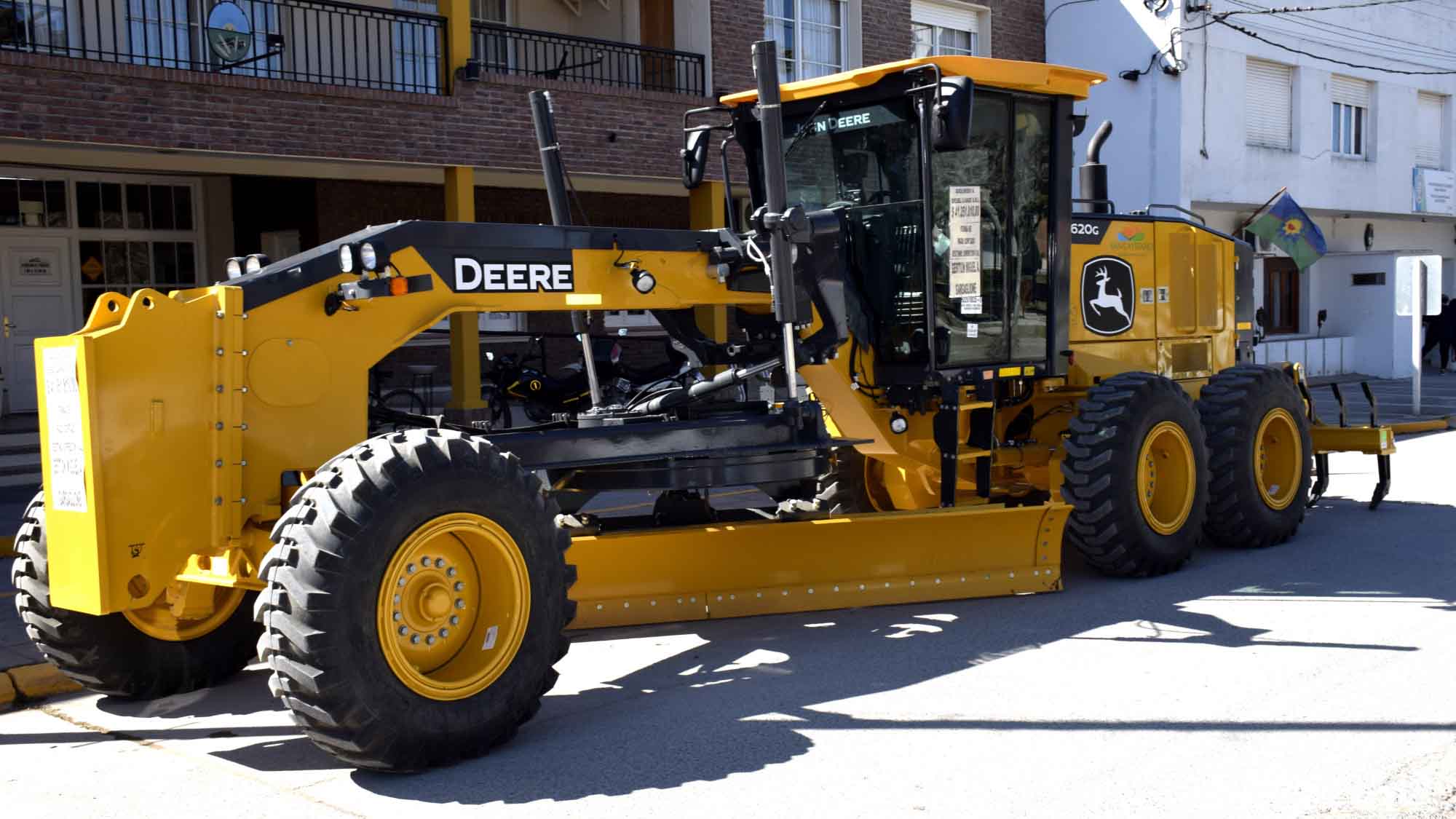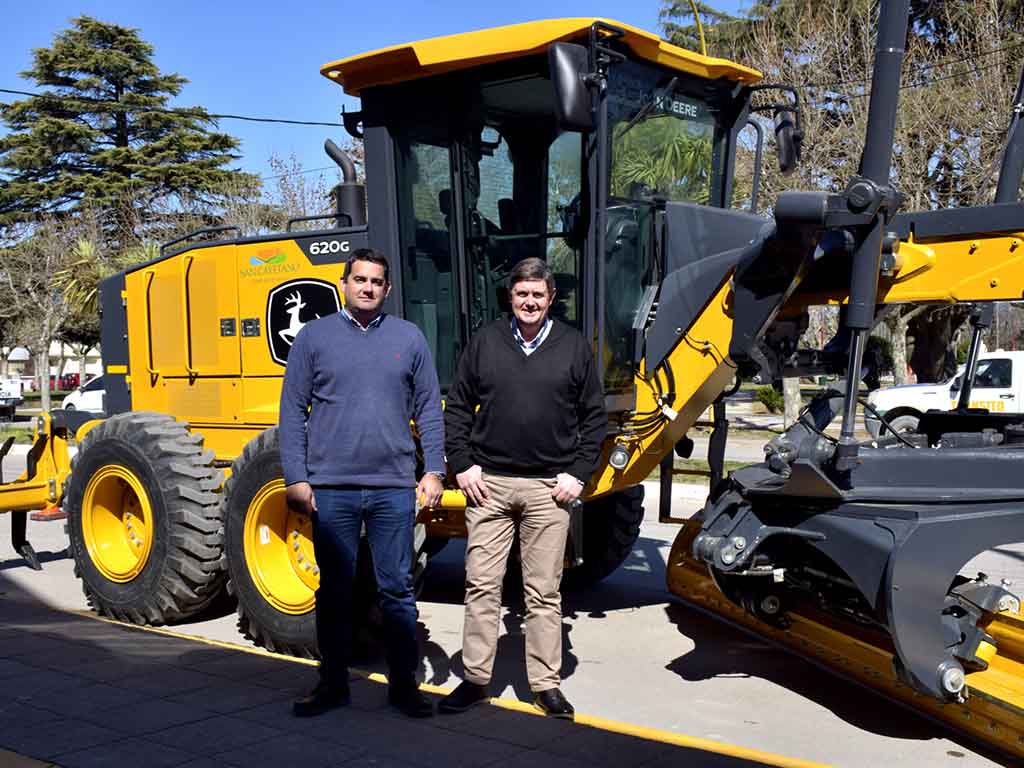 La motoniveladora articulada detrás de la cabina es marca John Deere modelo 620 GHE. El monto fue de $ 41.051.810, financiado mediante préstamo bancario.
