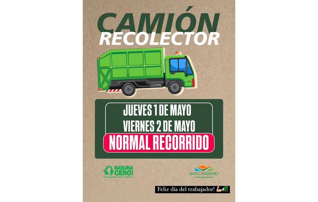 La Dirección de Medio Ambiente comunica que tanto el jueves 1º de mayo, feriado en conmemoración al Día de Trabajador, como el viernes 2, día no laborable con fines turísticos, el camión recolector de residuos domiciliarios realizará el recorrido de manera normal.