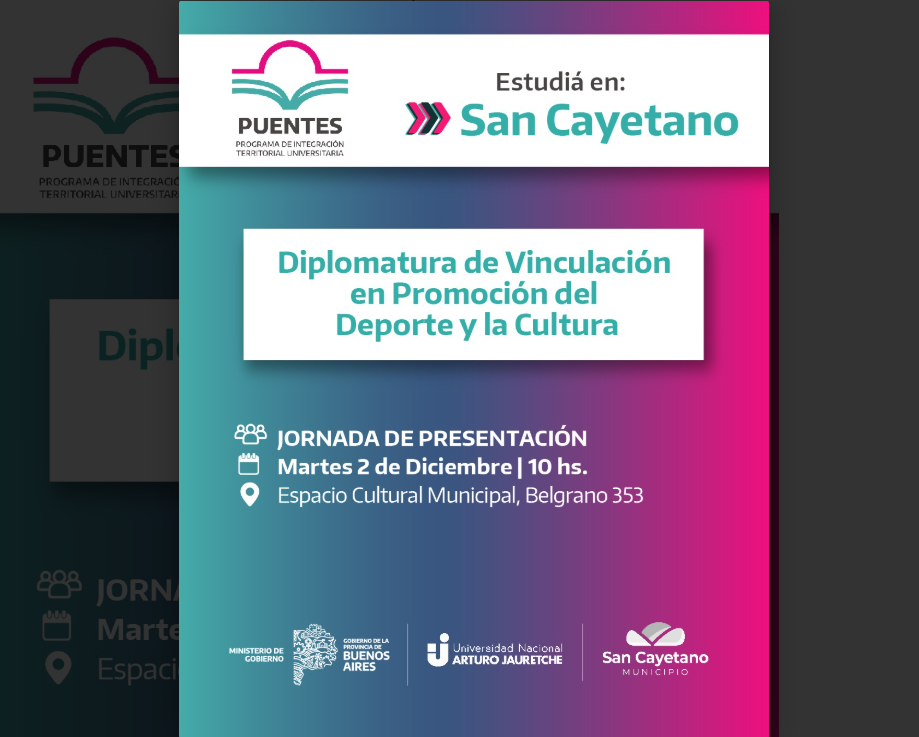 Esta Diplomatura se realiza mediante el Plan Puentes (Programa de Integración Territorial Universitaria del Gobierno de la Provincia de Buenos Aires) en articulación con la Universidad Nacional Arturo Jauretche (UNAJ) de Florencio Varela.