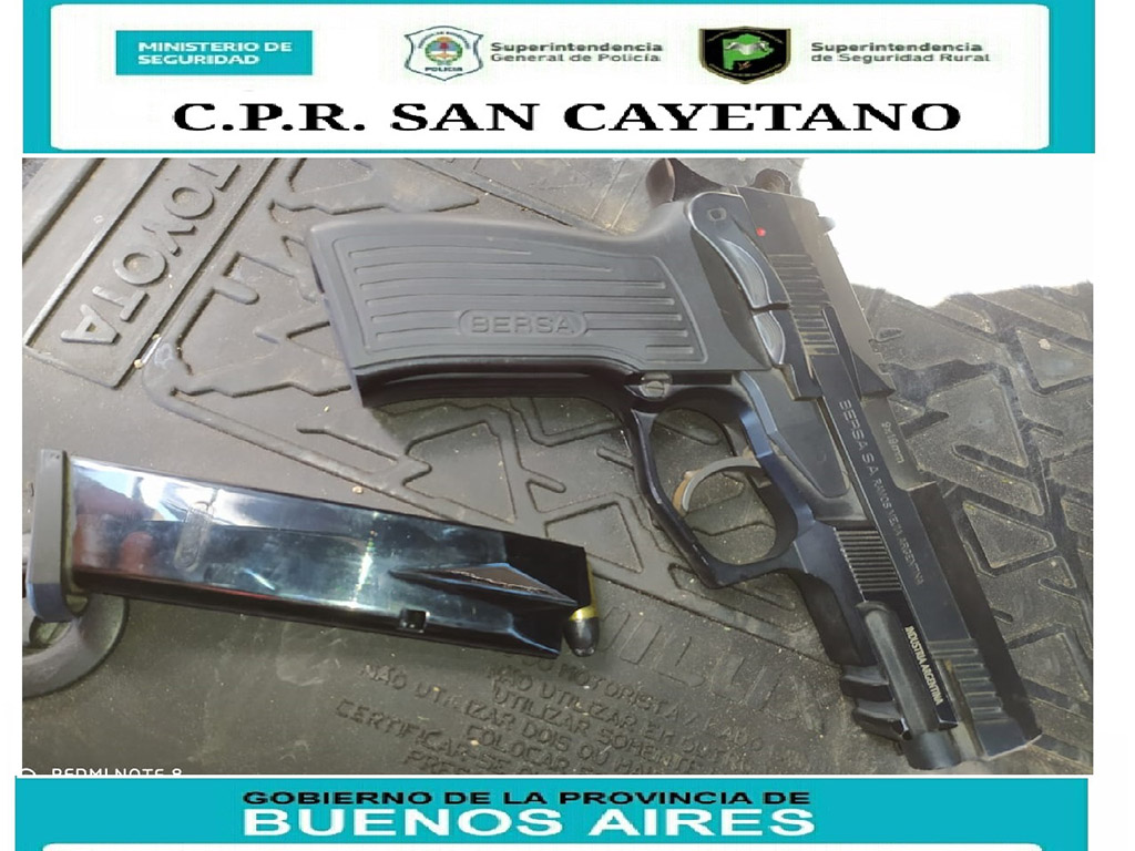Personal del Comando de Prevención Rural San Cayetano, cumplimentando Orden de Servicio «Prevención ilícitos en General especial interés Abigeato», en jurisdicción rural y rutas que acceden al partido, interceptó en cercanías al paraje El Indio cuartel II, del partido de San Cayetano, en sus límites con el partido de Adolfo Gonzáles Chaves, una camioneta en la cual circulaban tres personas del sexo masculino, que al realizar las requisas de rigor se constató que transportaban una Pistola semiautomática calibre 9 milímetros, marca Bersa con cargador conteniendo 9 municiones punta de polímero (las cuales pueden atravesar chalecos antibala como los utilizados por la policía).