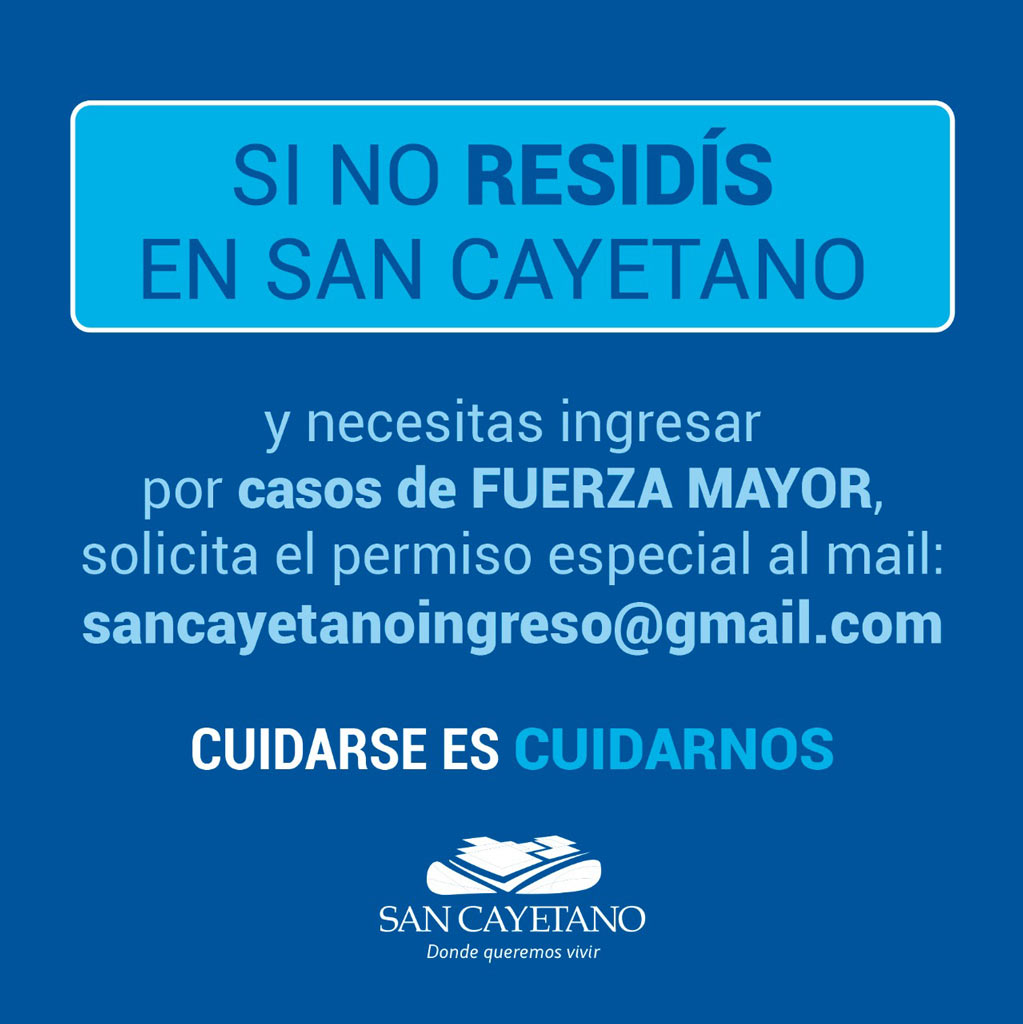 Se comunica a aquellas personas que NO residan de forma permanente en San Cayetano que, a partir de la fecha para ingresar a la ciudad deben enviar con 48 horas de antelación una solicitud al e-mail sancayetanoingreso@gmail.com en los casos de FUERZA MAYOR POR PERMISOS ESPECIALES.