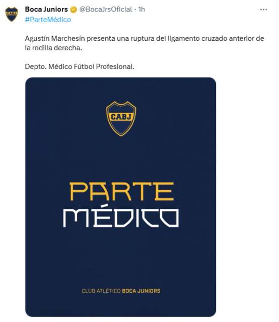 Horas después, y tras el anuncio oficial de Boca Juniors, se confirmó la baja de Agustín Marchesín por una ruptura del ligamento cruzado anterior de la rodilla derecha, lesión que lo dejará fuera de las canchas en un tramo decisivo de la temporada.