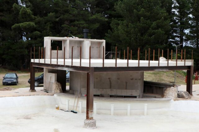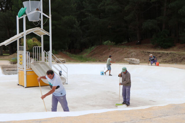 Previo a su llenado, personal municipal se encuentra pintando la pileta, en tanto que días atrás culminaron de acondicionar un sector para ser utilizado como estacionamiento.