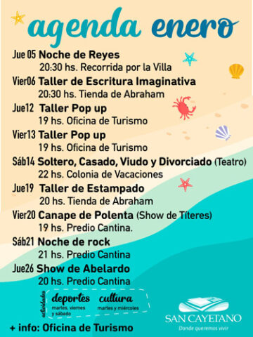 Variadas son las propuestas que ofrece el Municipio para el presente mes de enero en el Balneario San Cayetano. Diversidad de talleres, títeres, teatro, payasos y música conforman la agenda cultural del primer mes de la temporada 2023.