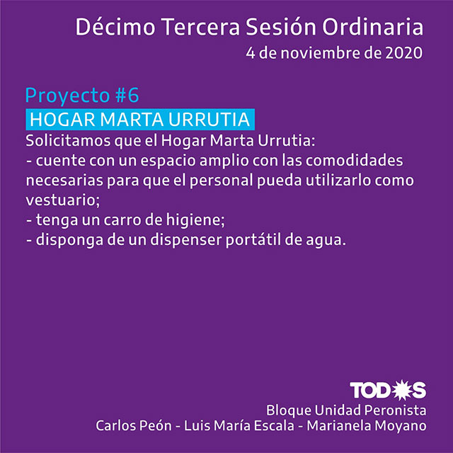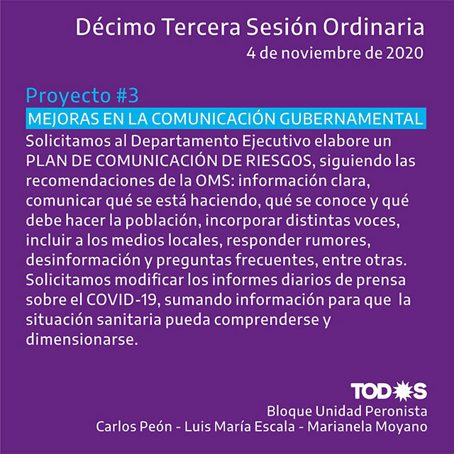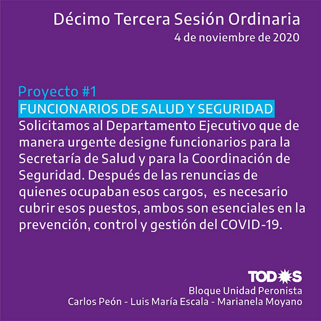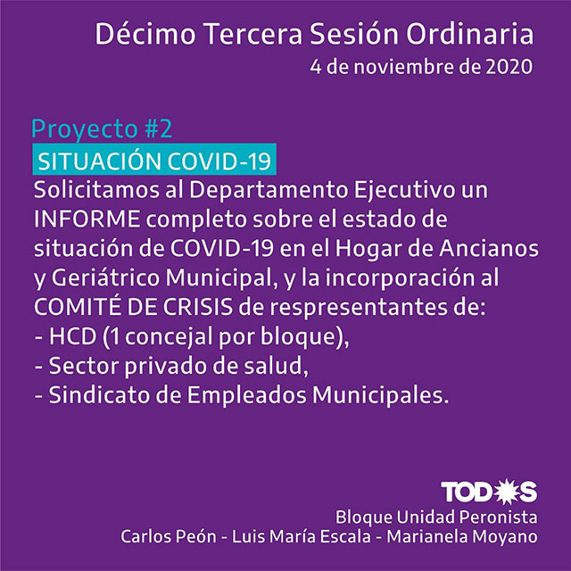 Los proyectos están referidos a la salud y a la situación del COVID-19 en la localidad: pedido de designación urgente de Secretario de Salud y Coordinador de Seguridad; informe sobre contagios y fallecimientos en Hogar de Ancianos y Geriátrico Municipal; incorporación al Comité de Crisis de representantes del Concejo Deliberante, salud del sector privado y del Sindicato de Empleados Municipales; desinfección en ambas residencias municipales para adultos mayores; elementos de trabajo para el Hogar Marta Urrutia; mejoras en la comunicación del gobierno; citación a autoridades del Sindicato de Empleados Municipales para conocer necesidades, reclamos e inquietudes de trabajadores municipales y respuestas del Ejecutivo desde el inicio de la pandemia a la fecha.
