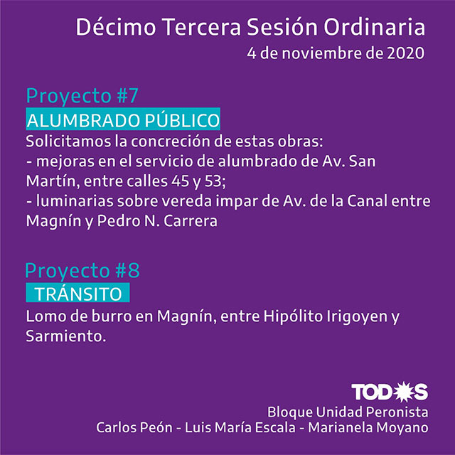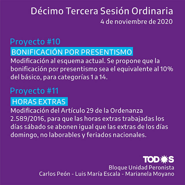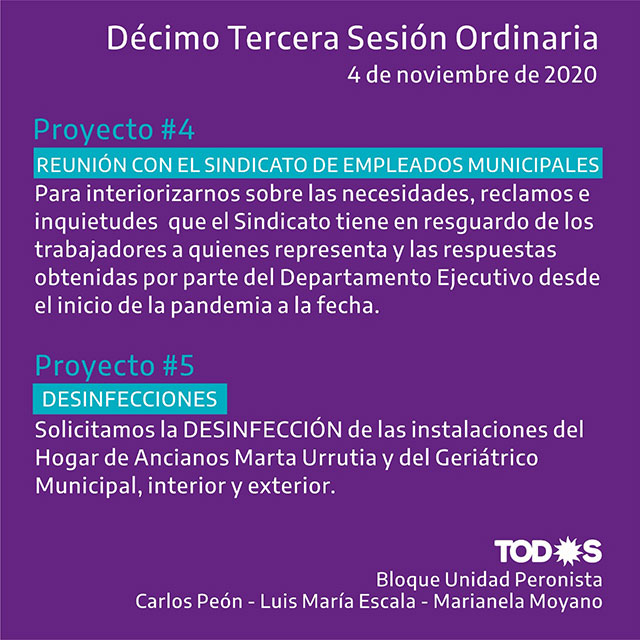 La Décima Tercera Sesión Ordinaria del Concejo Deliberante tendrá lugar mañana miércoles 4 de noviembre, bajo modalidad virtual. Los concejales Carlos Peón, Luis María Escala y Marianela Moyano, quienes forman parte del Bloque Unidad Peronista, comparten en este informe una síntesis gráfica de proyectos presentados (ver imágenes).