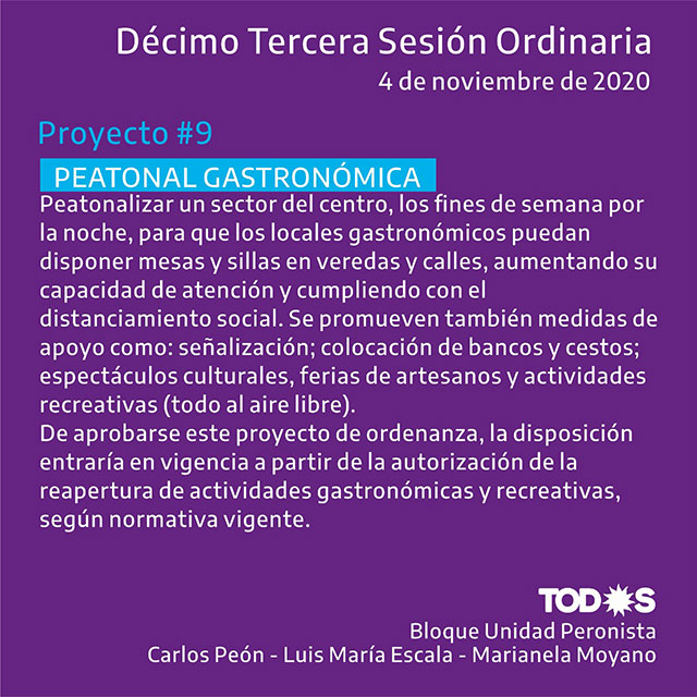Pensando en los locales gastronómicos que han debido cerrar sus puertas, atender bajo modalidad de delivery o atender a público con una capacidad limitada para asegurar el distanciamiento, se presentó un proyecto de ordenanza para crear el programa municipal “PEATONAL GASTRONÓMICA”. Se dispone la peatonalización nocturna y durante los fines de semana de un sector céntrico de la ciudad, permitiéndole a los locales comerciales sacar mesas y sillas a la vereda y calle. De aprobarse esta ordenanza, la disposición entraría en vigencia desde la autorización de la reapertura de las actividades gastronómicas y recreativas según normativa provincial y municipal vigente. Se promueven también otras medidas para apoyar y potenciar la peatonal gastronómica, como: señalización, instalación de bancos y cestos, espectáculos culturales – feria de artesanos – actividades recreativas (todas al aire libre).