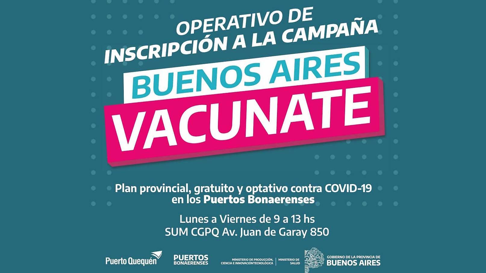 En el marco del operativo de inscripción a «Buenos Aires Vacunate», plan de vacunación provincial gratuito, público y optativo contra el COVID-19, mediante una acción articulada entre el Ministerio de Producción, Ciencia e Innovación Tecnológica y el Ministerio de Salud de la Provincia de Buenos Aires, el Consorcio de Gestión de Puerto Quequén, a partir del jueves 1 de julio, emplazará una posta en el SUM de sus instalaciones entre las 9 y las 13 horas de lunes a viernes para brindar acceso a la comunidad portuaria y peri-portuaria.