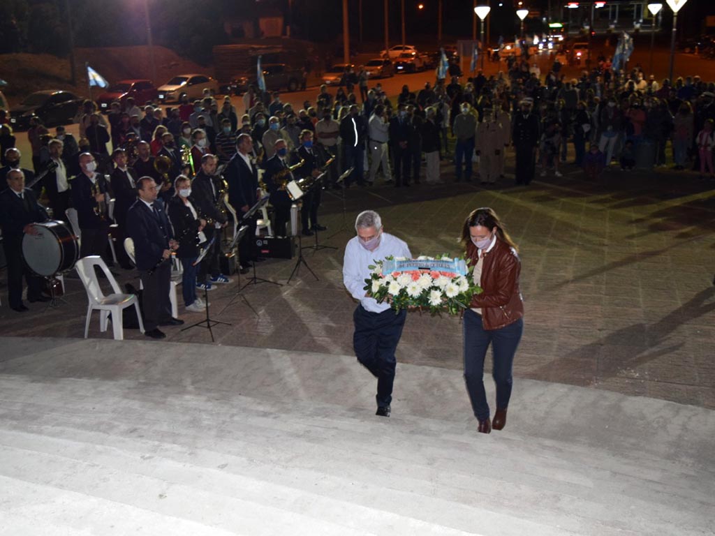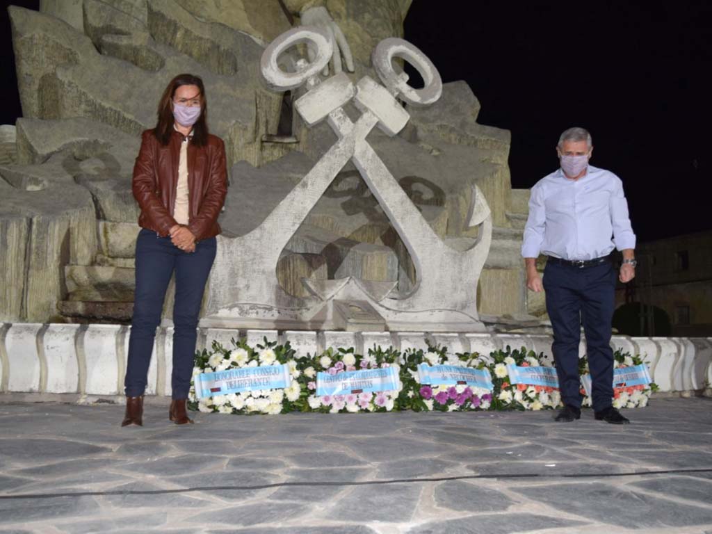 Luego, con un gran marco de vecinos e instituciones de la vida civil, tras entonar las estrofas del Himno Nacional, en el Monumento a la Gesta de Malvinas en Quequén, la Directora del Ente portuario Carina González y Oscar Morán depositaron la ofrenda la floral.