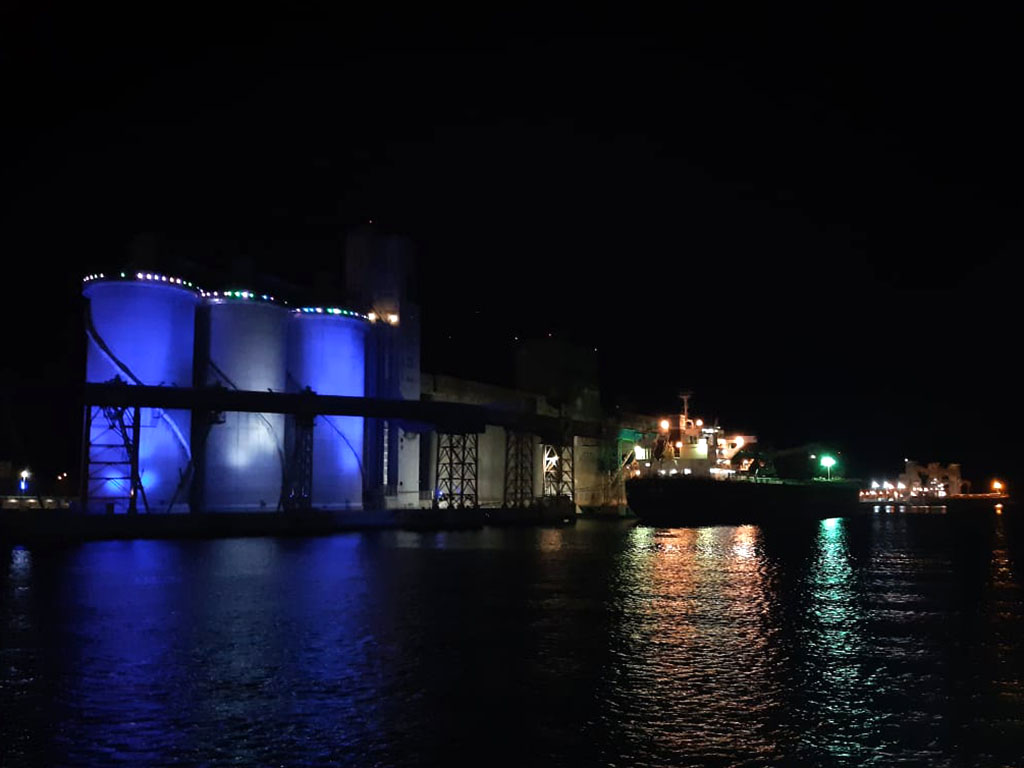 Durante toda la noche, los silos de la estación marítima se iluminaron de celeste y blanco en honor a los héroes de Malvinas.