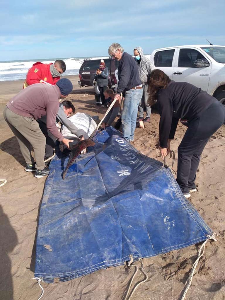 Con los cuidados y recaudos necesarios, avanzada la tarde personal de Prefectura con la colaboración de vecinos lograron llegar hasta la rompiente y devolverla a su hábitat natural.
