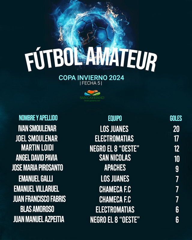 Durante el pasado fin de semana se disputó, en la cancha “Ramón Gazaneo” del Campo Municipal de Deportes, la quinta fecha del torneo Invierno de la Liga Amateur de Fútbol. Los resultados fueron los siguientes: