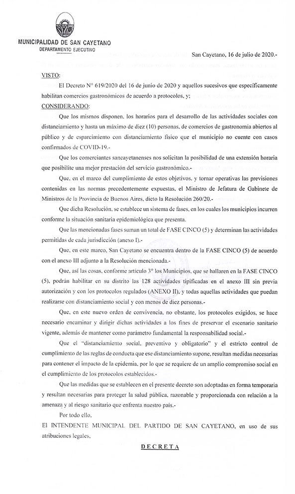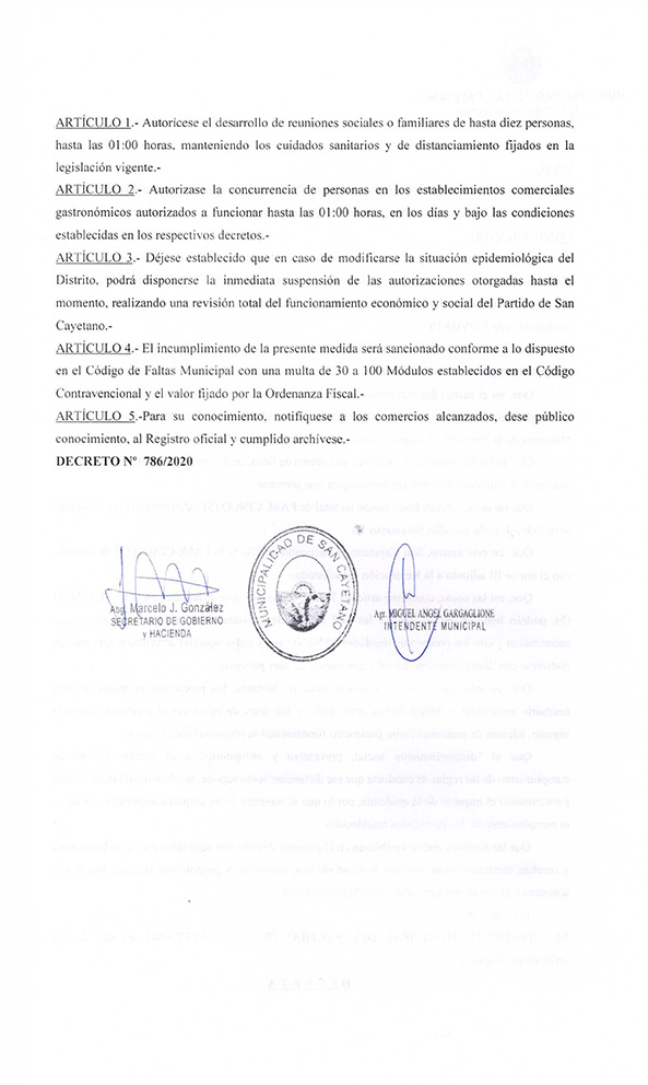 Atendiendo una solicitud de comerciantes sancayetanenses concerniente a evaluar la posibilidad de una extensión horaria que posibilite una mejor prestación del servicio gastronómico, el Intendente Miguel Gargaglione firmó el Decreto 786/2020 que autoriza el funcionamiento de dichos comercios hasta la 1:00 AM. También se extiende una hora las reuniones sociales.