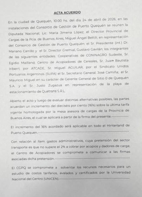 Luego de evaluar distintas alternativas, las partes acordaron un incremento del 16% sobre la última tarifa vigente homologada por la Mesa Asesora de Cargas de la Provincia de Buenos Aires. Dicho aumento comenzará a aplicarse desde la firma del acuerdo y tendrá alcance en todo el hinterland de Puerto Quequén.