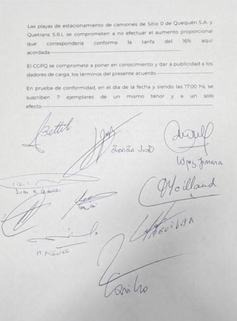 También se acordó “que las playas de estacionamiento de camiones de Sitio 0 y Quetrans no aplicarán el aumento proporcional correspondiente al 16% acordado en la tarifa”