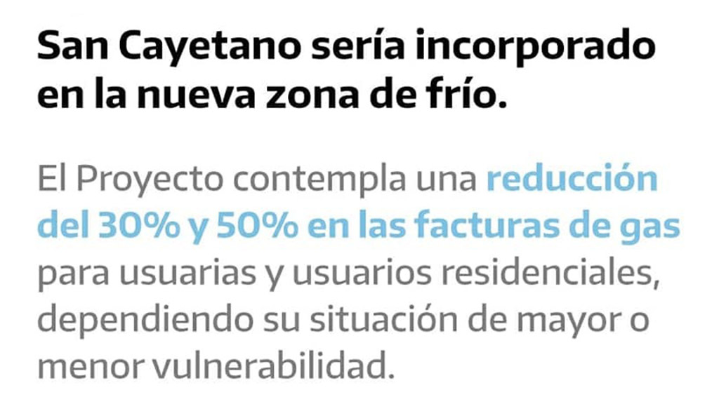 En la tarde de ayer el “Frente de Todos”, en conjunto con los bloques “Consenso Federal y Unidad” y “Equidad Federal” presentó un proyecto de ley de disminución de las tarifas de gas para las zonas frías que incluye a la ciudad de San Cayetano.